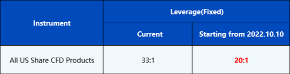 Please be advised that the leverage on all US Share CFDs products will be adjusted starting from 10th October 2022 to further optimise the competitiveness and improve the trading environment.