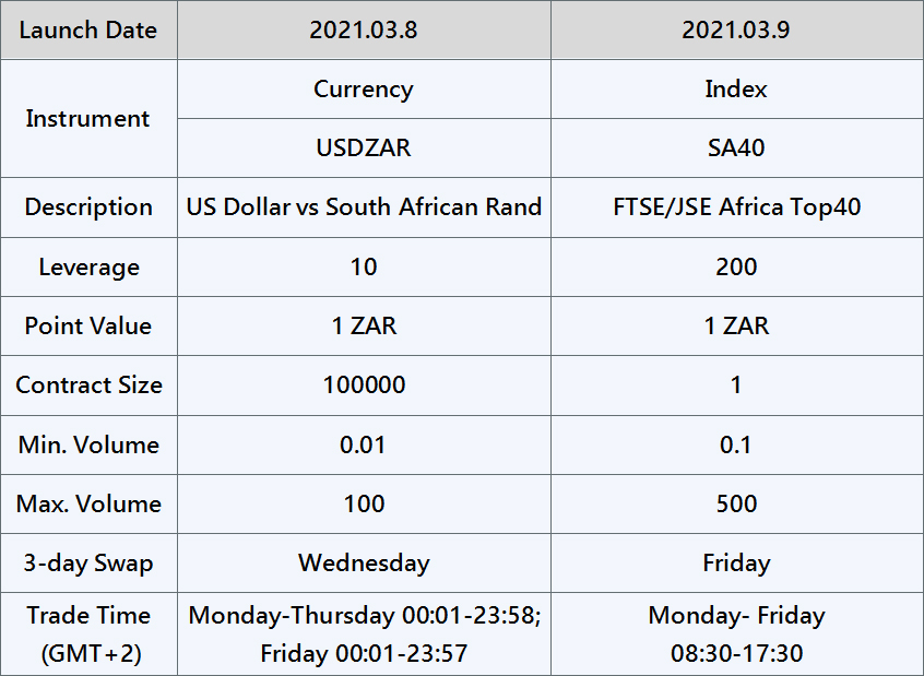 To provide a broader portfolio of products, Pacific Union will launch the new products of USDZAR and SA40 as per the dates in the table below.