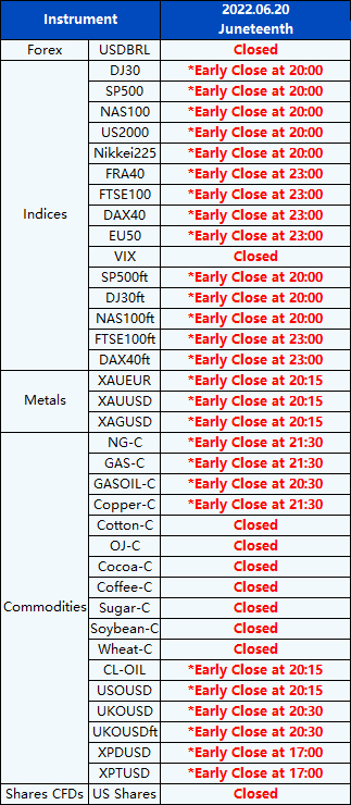 Please be advised that the following instruments’ trading hours and market session times will be affected by the upcoming Juneteenth holiday.