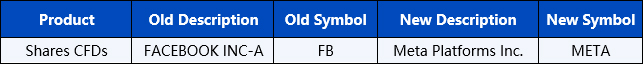 If you are holding an open position overnight on 17th June 2022 before changes implemented, the symbol of your order will be updated to META on 20th June 2022. The changes will only impact the symbol renamed. The product specifications will remain unchanged and this will not affect your open positions or close any of your open positions.