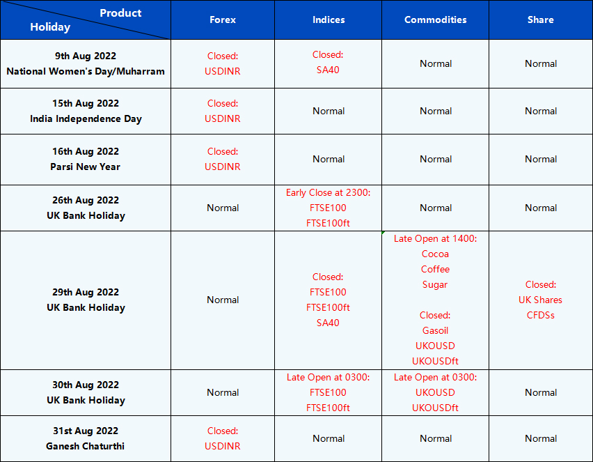 Please be advised that the following instruments’ trading hours and market session times will be affected by the upcoming August holidays.