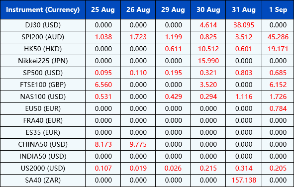 Please be advised that the dividends of the following index CFDs will be adjusted by upcoming ex-dividend dates. The comment for trading index CFDs will be in the following format “Div&<Product Name>&<Net Volume>” which show in the balance after the close of the day before the dividend payment date.