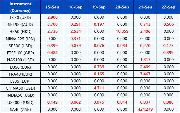 Please be advised that the dividends of the following index CFDs will be adjusted by upcoming ex-dividend dates. The comment for trading index CFDs will be in the following format “Div&<Product Name>&<Net Volume>” which show in the balance after the close of the day before the dividend payment date.