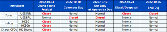 Please be advised that the following instruments’ trading hours and market session times will be affected by the upcoming Oct holidays.