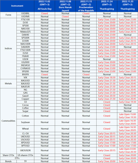 Please be advised that the following instruments’ trading hours and market session times will be affected by the upcoming November holidays.