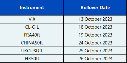 Please be advised that the following CFD instruments will be automatically rolled over as per the dates in the table below. As there can be a pricing difference between old and new futures contracts, we recommend clients to monitor their positions closely and manage positions accordingly.