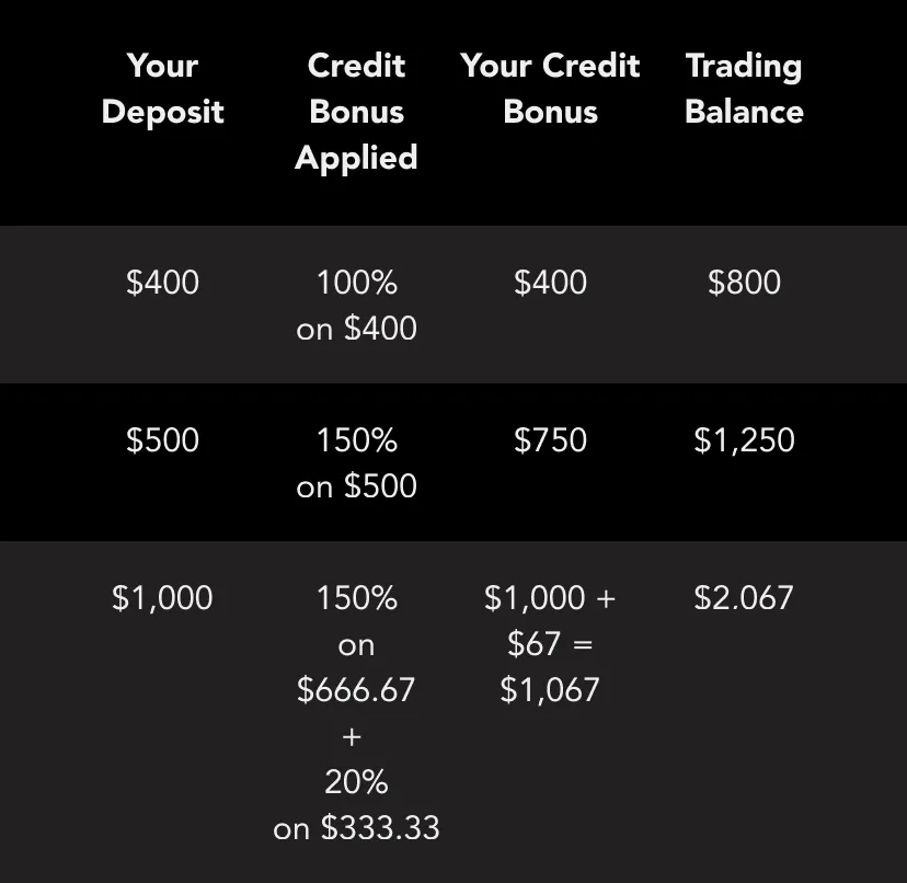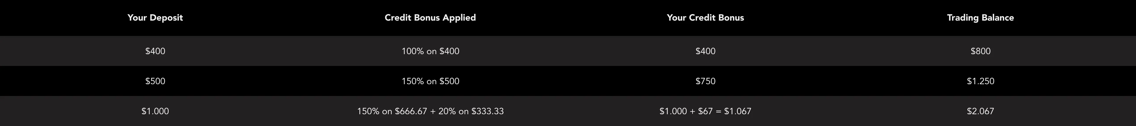 5.Eligible Clients (both new and existing clients), who meet the criteria set forth herein are able to receive credit bonuses or otherwise known as trading credit, equal to: