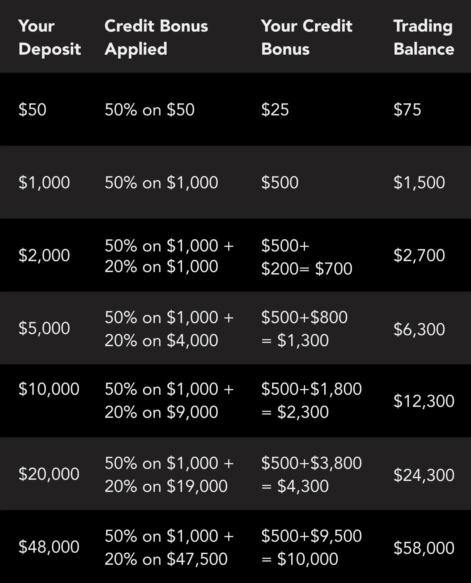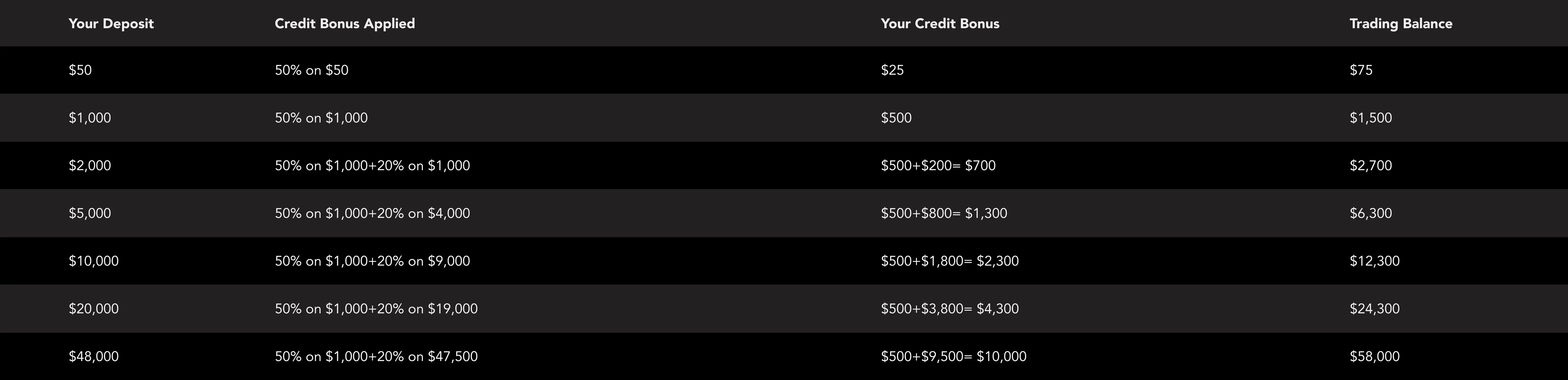 *Any profits generated from closed orders can be withdrawn at any time. However, withdrawing any portion of your original deposit will result in the proportional removal of your credit bonus. Transferring funds between your trading accounts is also considered withdrawal.